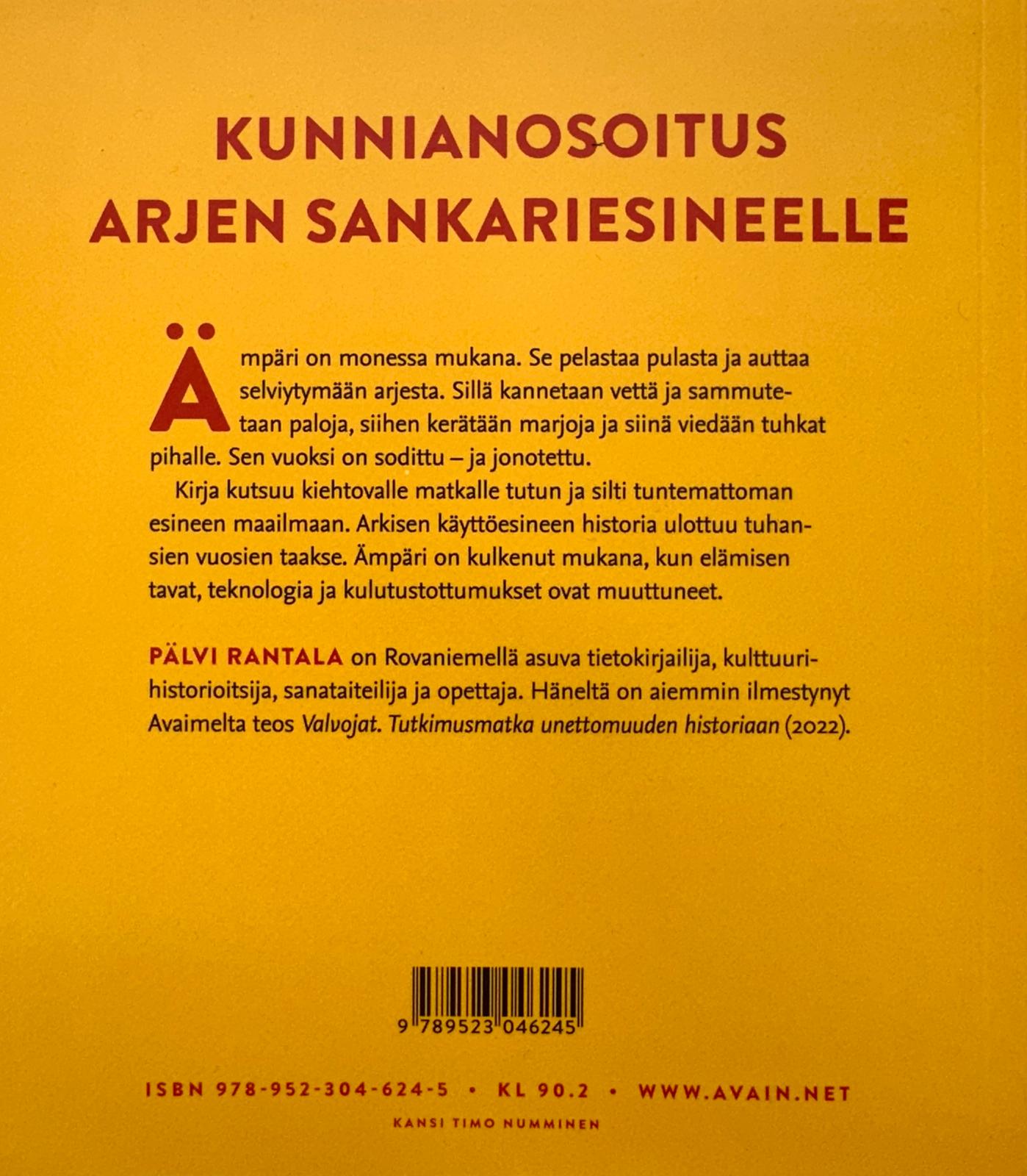 Näin kertoo Pälvi Rintalan uuden Ämpäri, arjen sankariesine -kirjan esittelyteksti. Kirja luotaa ämpärin moninaista historiaa hauskasti ja elävästi. Se vie lukijaansa muinaisesta Egyptistä Rooman kautta Suomen Turkuun ja luonnollisesti myös Tervolaan, jonka ämpäripäisyydestä on kirjassa oma kappaleensa.