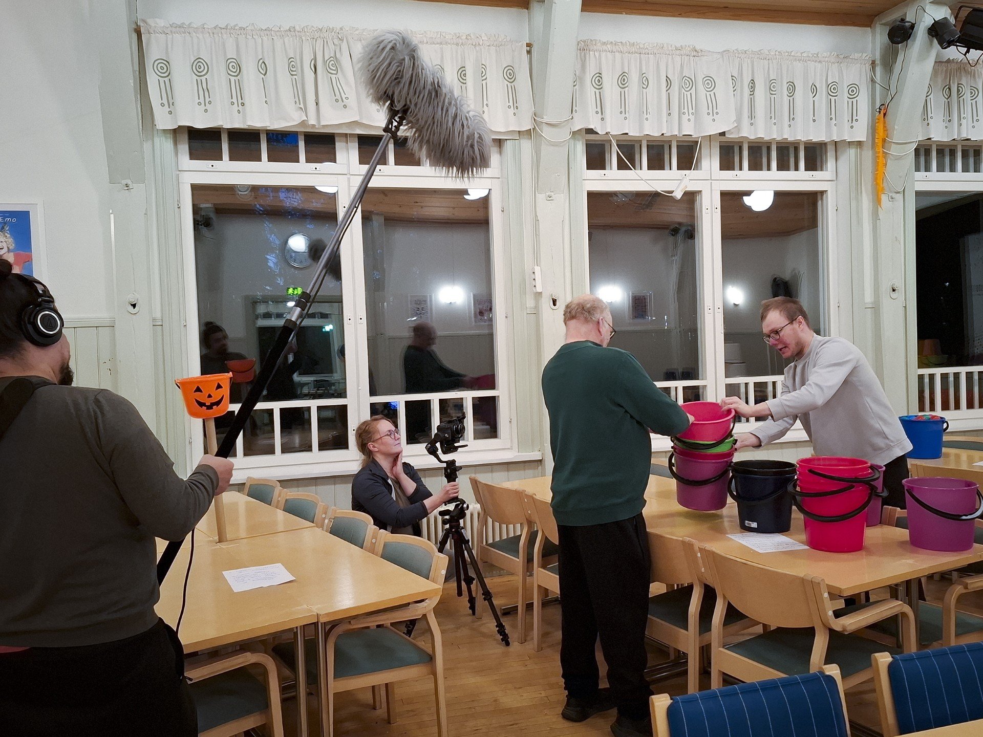Tervolassa päästiin kuulemaan, miten ämpäriaiheinen kirja syntyi ja näkemään, kun dokumentaristi kuvasi dokumenttia ämpäreistä.