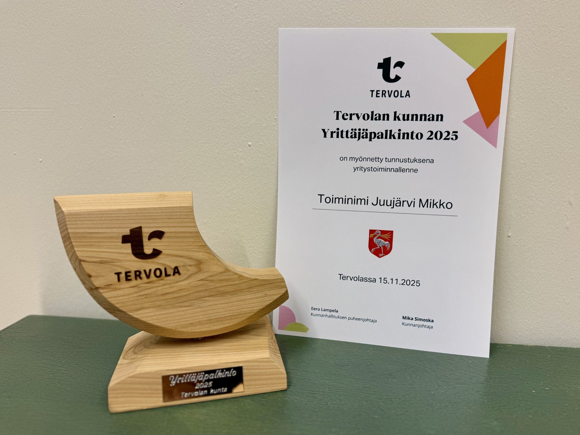 ”Ainahan se tunnustus tuntuu mukavalta, varsinkin kun se tulee muilta yrittäjiltä, Juujärvi kommentoi palkintoa”.