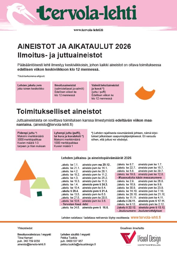Seuraava Tervola-lehti ilmestyy keskiviikkona 17. joulukuuta. Vuoden 2026 ensimmäinen lehti ilmestyy 7. tammikuuta. Lehden aineistot tulee toimittaa maanantaihin 29. joulukuuta kello 12 mennessä.