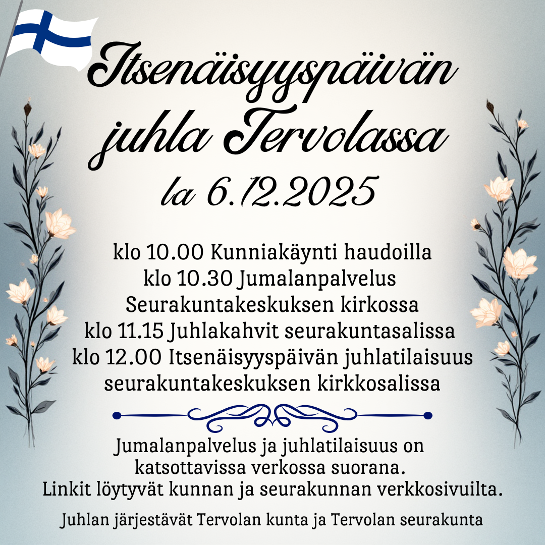 Jumalanpalvelus ja juhlatilaisuus on katsottavissa verkossa suorana Tervolan seurakunnan YouTube-kanavalta.