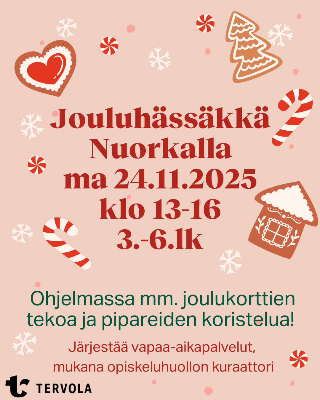 Maanantaina 24.11. vietetään nuorisotila Nuorkalla jouluista teemapäivää. Ohjelmassa mm. joulukorttien tekoa sekä pipareiden koristelua.
