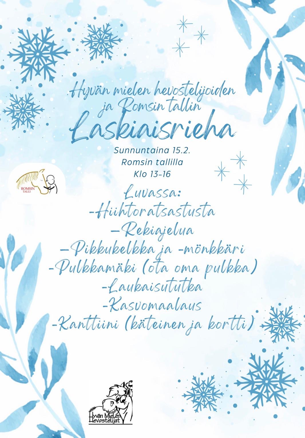 Hyvän mielen hevostelijoiden ja Romsin tallin järjestämä laskiaisrieha sunnuntaina 15.2.2026 klo.13-16. Ohjelmassa muun muassa rekiajelua, hiihtoratsastusta, laukaisututka ja pulkkamäki! Kanttiinista pientä purtavaa, kortti tai käteinen. Tervetuloa!