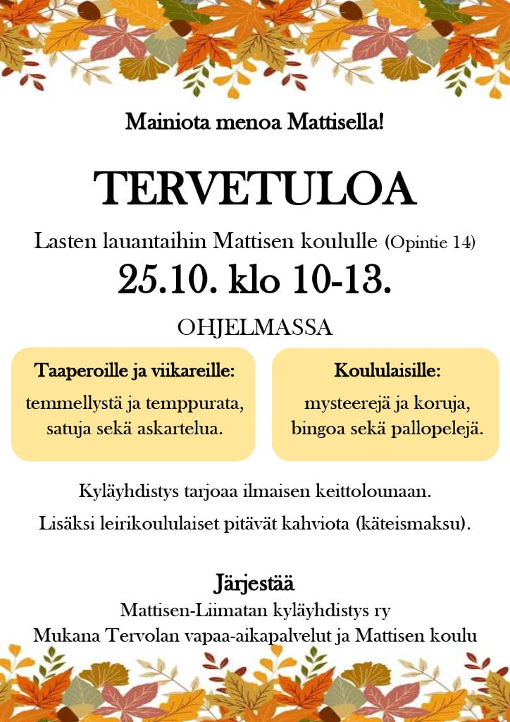 Lasten lauantai 25.10. klo 10-13 Mattisen koululla (Opintie 14).