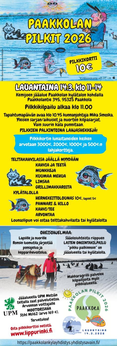 Paakkolan Pilkit 2026 – tapahtumapäivä lauantaina on 14.03.2026 Kemijoen jääaluella Paakkolan kylätalon kohdalla