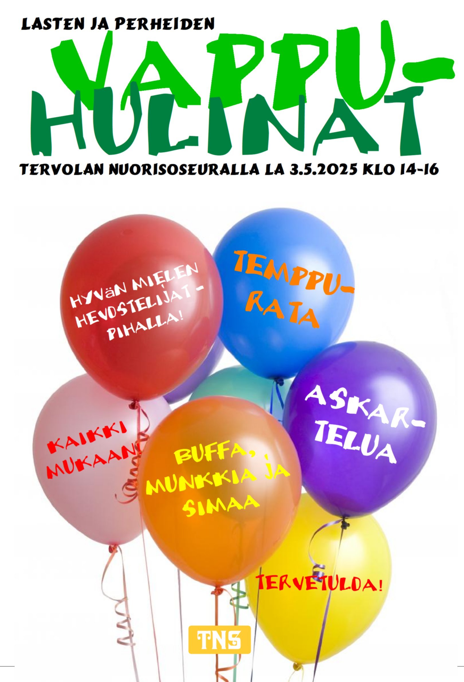 Lasten ja perheiden VAPPUHULINAT Tervolan Nuorisoseuralla lauantaina 3.5 klo 14-16.